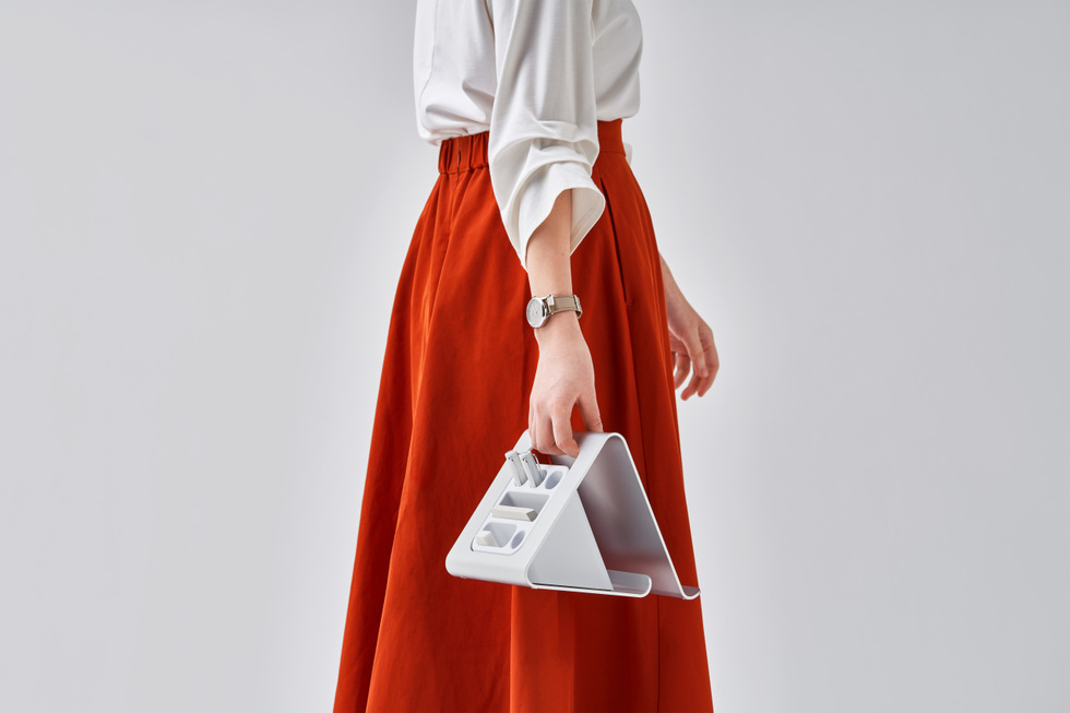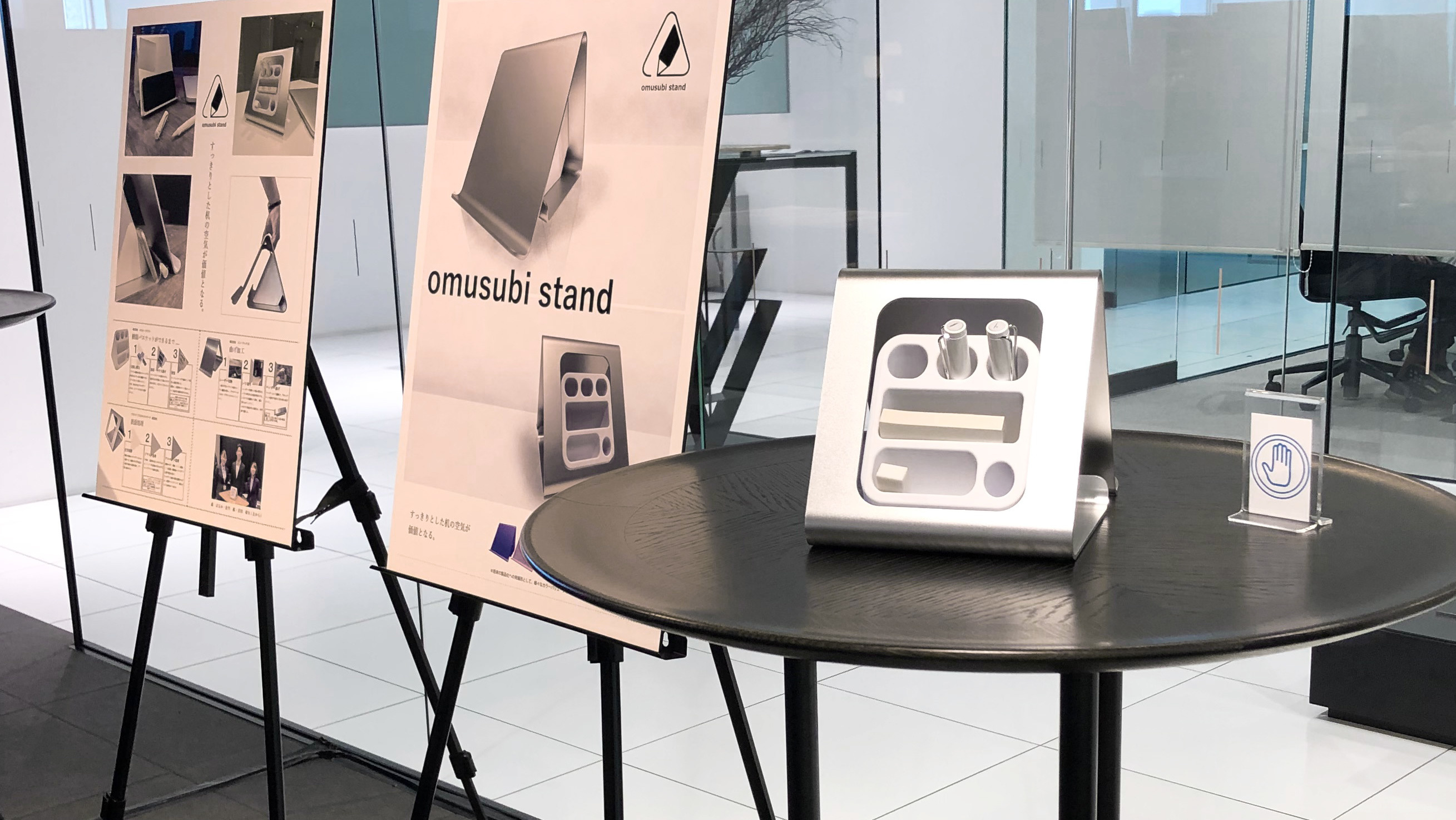 最終成果物である「omusubi stand」と名付けられたプロダクト(プロトタイプ)は、曲げ加工によるアルミニウム板と、樹脂成形を想定した「箱」を組み合わせることで構成されています。