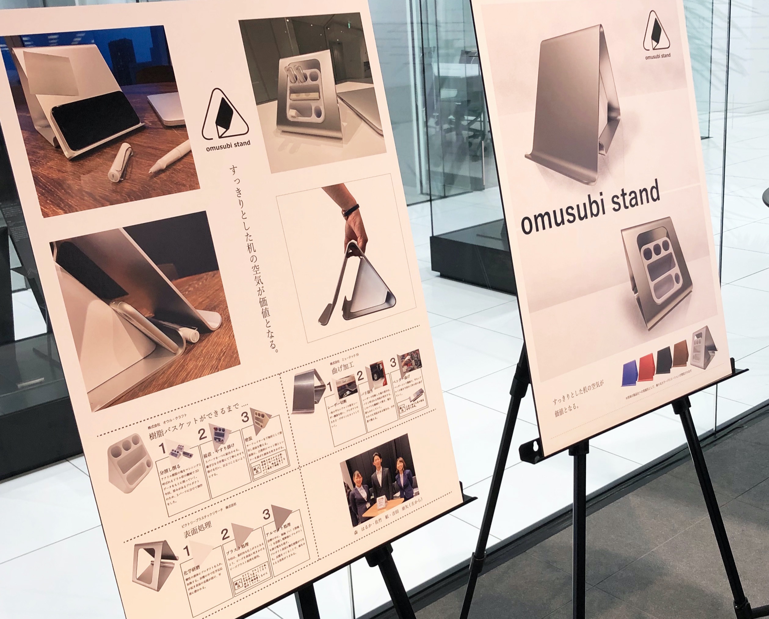 最終成果物である「omusubi stand」と名付けられたプロダクト(プロトタイプ)は、曲げ加工によるアルミニウム板と、樹脂成形を想定した「箱」を組み合わせることで構成されています。