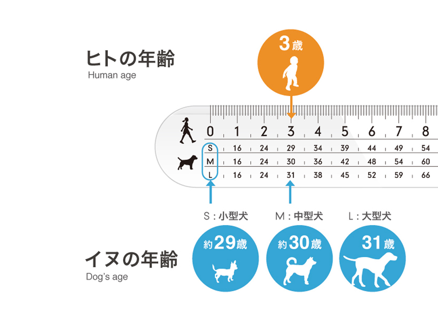 長さを測る数字は「ヒトの年齢」を表し、その下に配置された小さな数字は「イヌの年齢」を表します。
